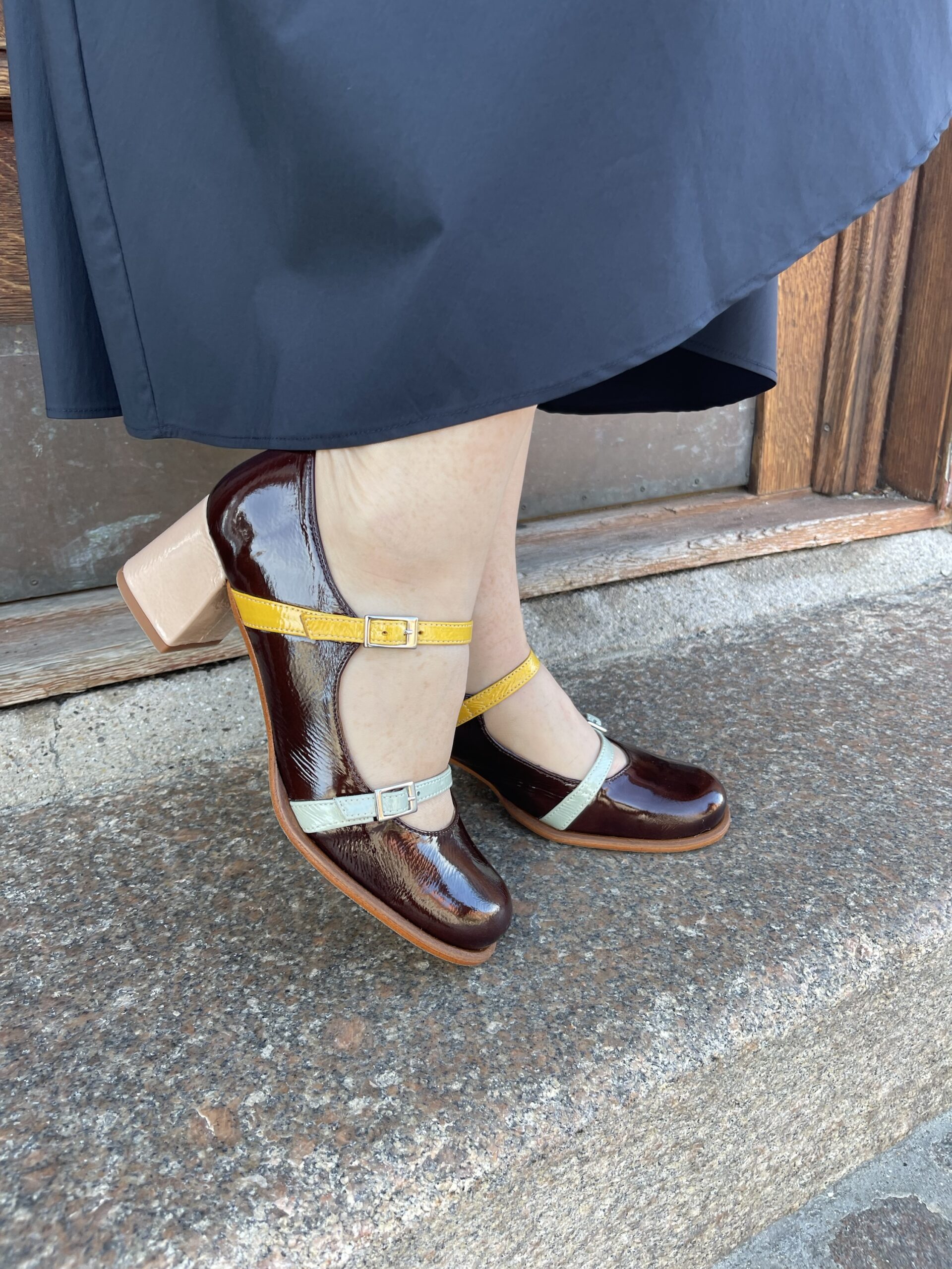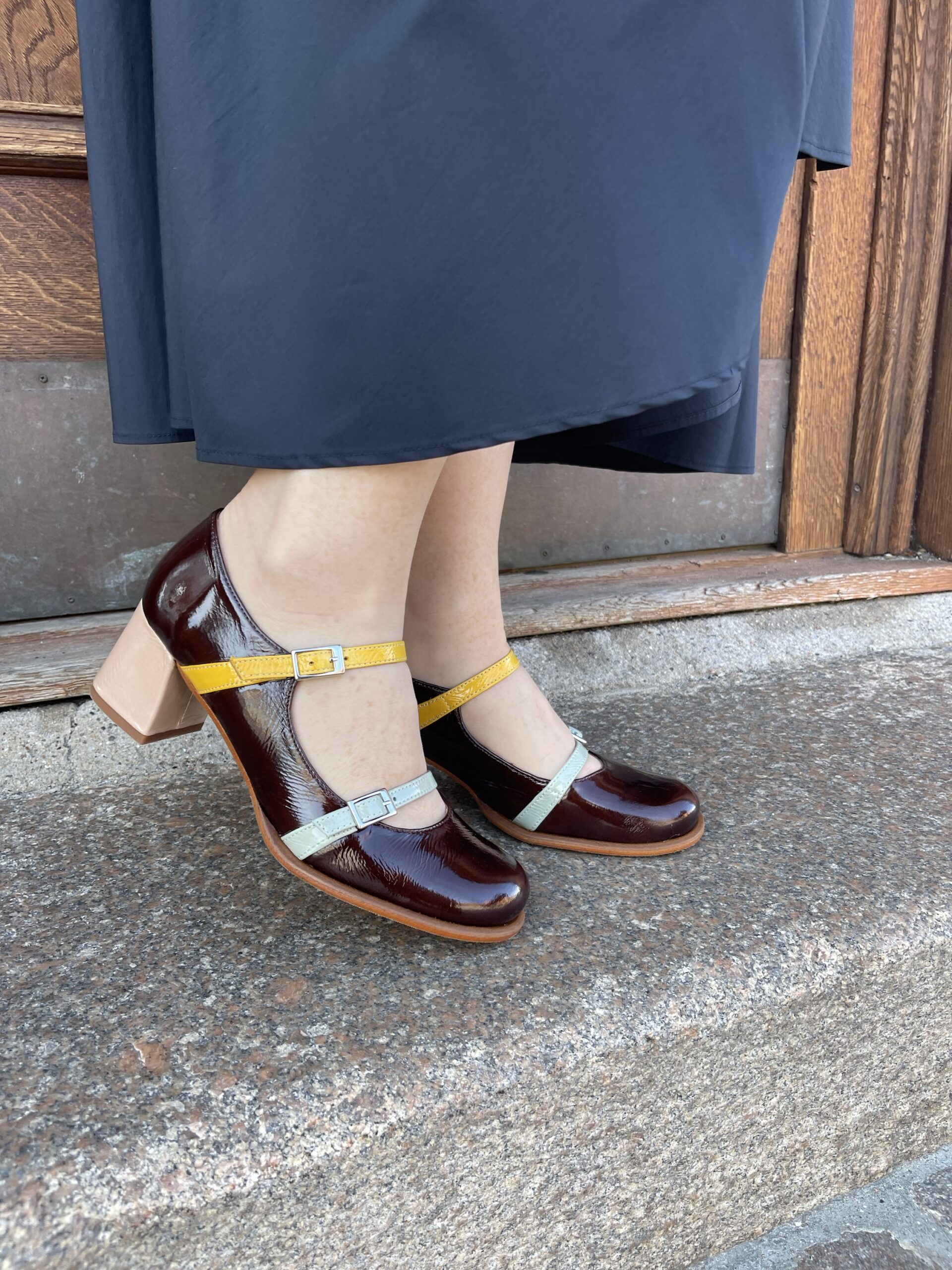 Pump i brun og double rem.